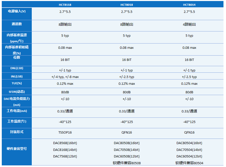 HCT8X1X为SPI接口的8独立通道、16BIT高精度DAC芯片,可用于工业控制、通信、消费电子等对精度和稳定性要求较高的领域。